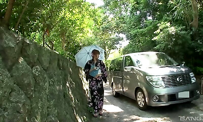 Kimono doll in a van sucks dick and gets toy fucked